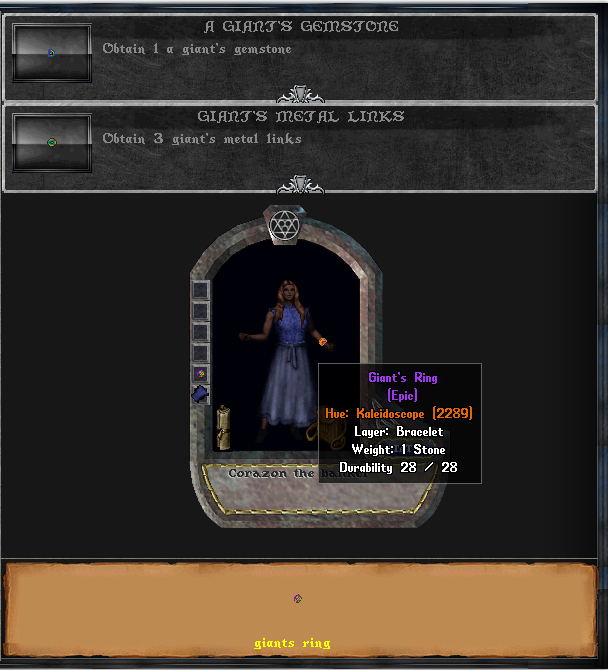 Collect one giant’s gemstone and 3 giant’s metal link to form a Giant’s Ring. This ring can be blessed with a CLOTHING blessed deed and layered with deeds.