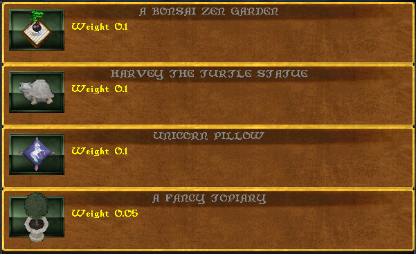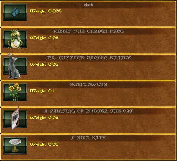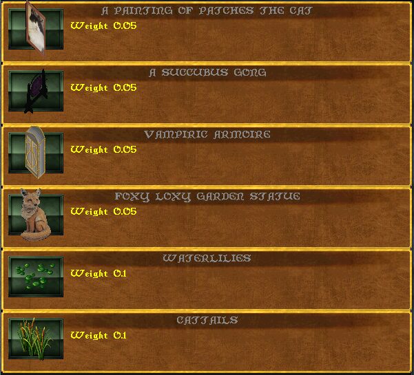 Some goodies you can find in Sanctuary: A painting of Buster the cat (flips with a deco tool), bird bath, scimitar rack (a turnable container).
