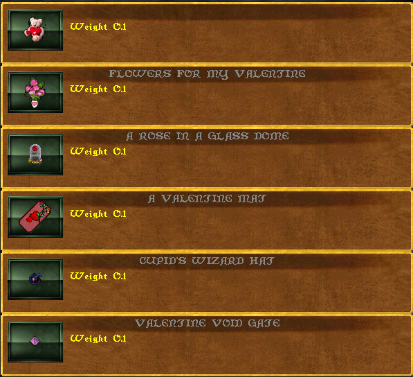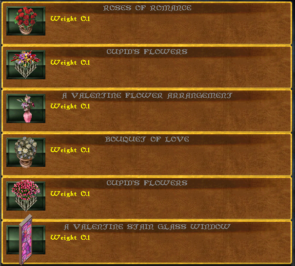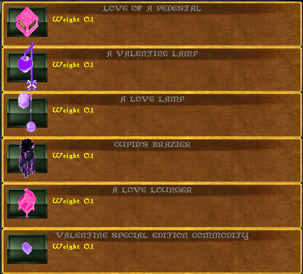 Lover and Fight Helm, crystal lights, master beds, love seat, mystic light, and romantic peacock statues will come in a random Valentine hue.
